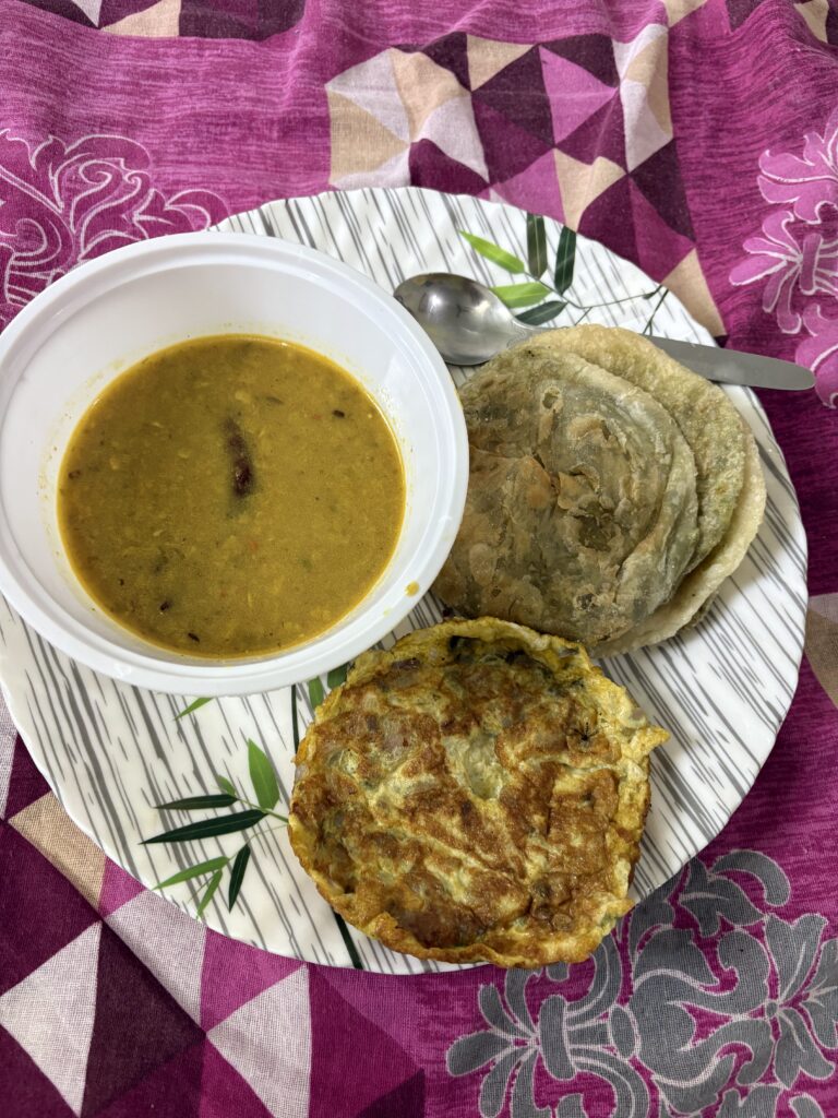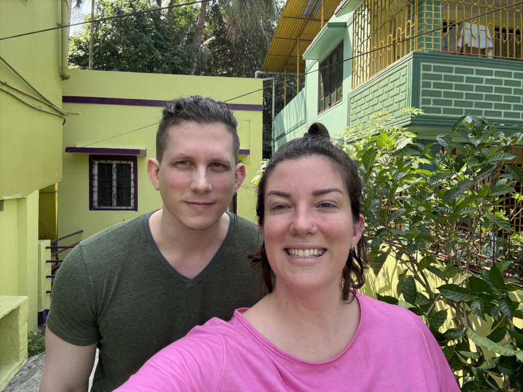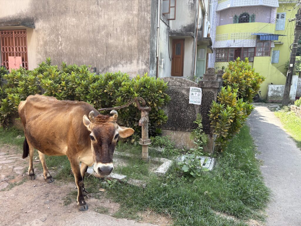 The next morning, our lovely hosts made us a traditional Bengali breakfast. It was delicious—flaky luchi (deep-fried flatbread) and aloo dum (spiced potato curry)—but wow, so spicy! And only about $1 USD per person. As we checked out, we were greeted by a cow casually strolling past our doorstep. Just your average morning in India.