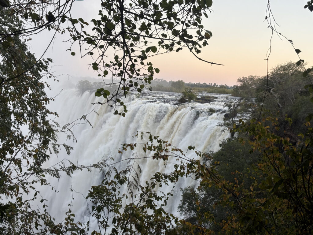 The next day, I got up early and arrived at Victoria Falls right at opening. Known locally as Mosi-oa-Tunya—“The Smoke That Thunders”—the falls are the largest curtain of falling water on Earth, over 5,600 feet wide and 350 feet tall.